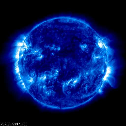 La imagen azul está tomada en 171 ángstroms y permite ver el material solar a 1 millón de grados Kelvin (999.723ºC).